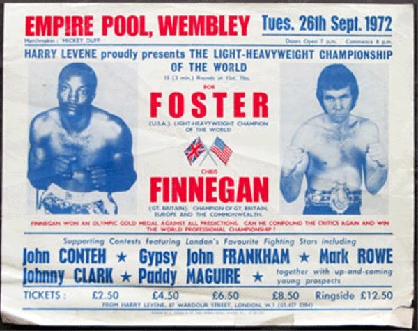 Ce dont manquait son règne en mi-lourds, au fond, était une défense de titre plus âpre que les autres, l’occasion de puiser dans ses réserves et de montrer qu’il ne se serait pas contenté d’aplatir une génération entière déjà bien dépourvue de relief. Un voyage à Londres lui en offrit l’opportunité : il y affronta en septembre 1972 le champion d’Europe Chris Finnegan, pugiliste anglais bien dans son époque, rouflaquettes, peau laiteuse et goût revendiqué pour la bière servie tiède. Mais le bougre était gaucher, endurant et champion olympique des moyens en 1968. Galvanisé par l’ambiance virile et enfumée d’une Wembley Arena pleine à craquer – on l’appelait alors « Empire Pool » – l’ex-maçon Finnegan décida qu’il mettrait du temps à mourir. D’entrée, il se déplaça intelligemment autour du prédateur à sang froid, lequel peinait à contrer son jab de fausse garde avec efficacité. Lorsque Foster trouva sa cible aux troisième et quatrième rounds, loin d’emboutir pour de bon ou tétaniser Finnegan, il libéra un agresseur agile, capable d’entrer et sortir sans dommages de la zone de danger pour travailler de près. Finnegan accéléra encore après un nouveau marron encaissé dans la septième reprise. Aux deux tiers du combat, l’idée que cette douzième défense pût être la dernière semblait moins saugrenue que sur le papier.