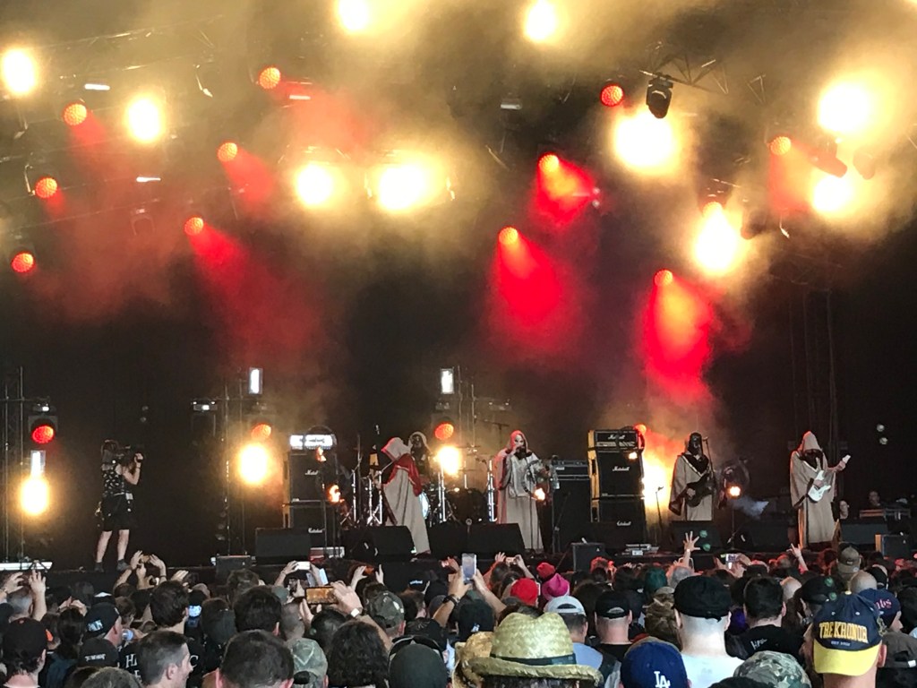 Pile au moment où la France revient aux joies des années Auriol et Coty, quitter Dying Fetus est un crève-cœur, justifié par le premier dilemme d’agenda cornélien de ta journée : sur le Mainstage 2 se produit un grand habitué du Hellfest, cette fois comme frontman de Down, son supergroupe de southern rock pachydermique. Orphelin de Pantera depuis bientôt 20 piges, moulé dans un Tshirt Black Sabbath Vol 4, Phil Anselmo n’a pas rajeuni. Sur scène, sa présence physique est l’ombre de ce qu’elle fut. Entre deux titres, il mâchouille ostensiblement son chewing-gum et affiche une mine plus blasée qu’un Michel Sardou. Pourtant sa putain de voix n’a jamais mieux sonné à tes oreilles : le bougre ne se prend plus pour une diva extrême, il s’accorde magnifiquement aux riffs lourds et graisseux du duo Keenan-Windstein. Après un monumental Stone the Crow, les techniciens remplacent les zicos sur Bury Me in Smoke pour le final. Toi, tu souris comme un con. Une fois n’est pas coutume, tu tentes avec succès de te trouver un spot vers le quatrième rang en prévision de ce qui suivra en Mainstage 2, avec un fond sonore carrément luxueux pour l’attente : KoЯn sur le 1. « Do you want to hear some new shit ? » demande un Jonathan Davis au meilleur de sa forme. C’est que le groupe a bossé, publiant deux disques depuis son dernier passage à Clisson. Sorti de son premier album éponyme, tu n’es pas un spécialiste des grands anciens du nu metal, mais l’énorme son de basse caractéristique du groupe et la voix très versatile de Davis te ravissent en s’ajustant sans le moindre accroc. Il te semble reconnaître One et We will rock you, ce que ne confirment pas les comptes-rendus officiels. Ton âge, peut-être. Sur écran géant, la grosse tache noire sous l’ongle du pouce d’un des gratteux rappelle combien le groupe entretient son look de clodos. Et fallait-il vraiment que Davis joue de la cornemuse (NB : foutez la paix à Bon Scott, il est mort en 1980) ? Toujours est-il que l’imparable Blind vient clore une prestation de haute volée. Les vétérans ont assuré, qu’en sera-t-il des ancêtres ?