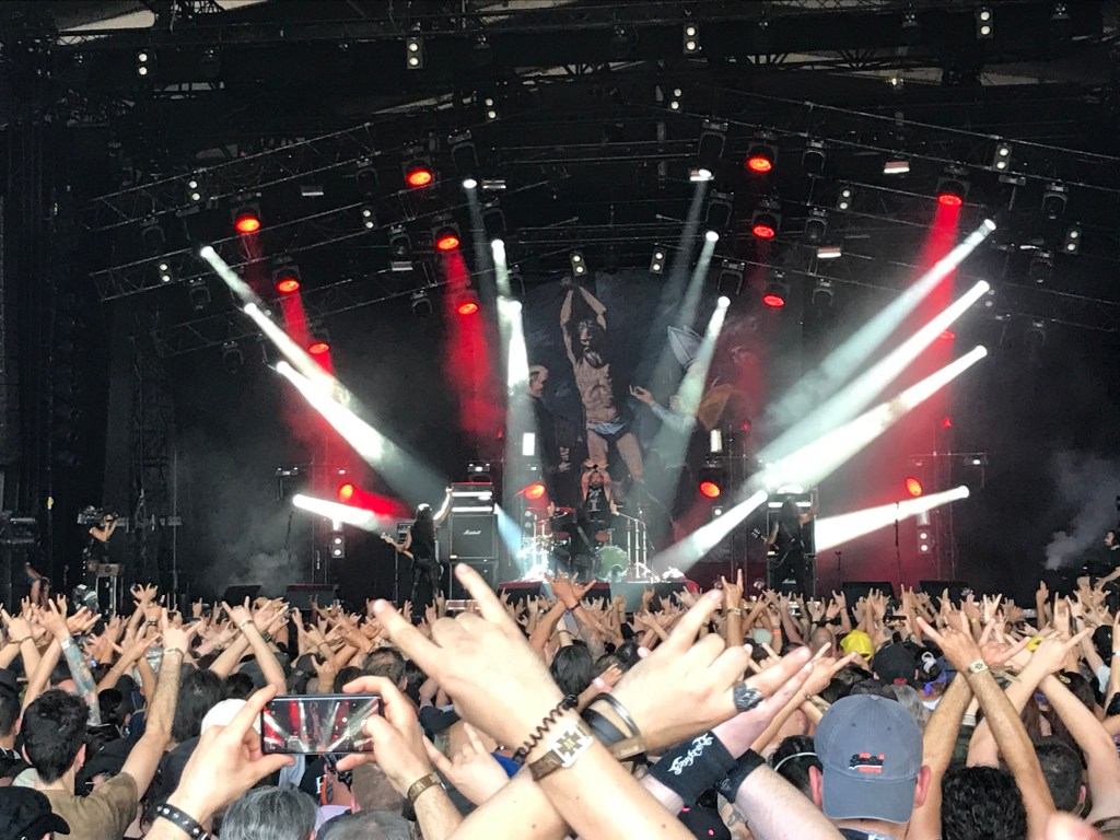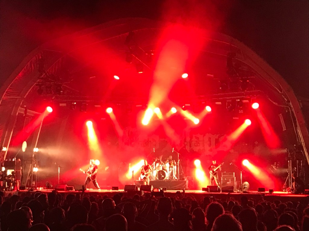 Autant dire que tu passes de la salle Pleyel au creuset d’un haut fourneau. Impossible de prendre des notes une fois agrégé à l’amas bouillant et protéiforme qu’est la foule massée aux pieds des Brésiliens de Sepultura. Tu te rappelles avoir viré tes bouchons d’oreilles, incapable de discerner les riffs mythiques d’Arise, une décision plus ou moins compréhensible pour des sujets sains d’esprit. Le son n’est ni le plus net ni le plus équilibré du festival, en revanche l’intensité des tauliers du thrash et du groove metal sud-américains ne se discute pas. La setlist alterne avec bonheur entre titres anciens et nouveaux – mention au formidable Means to an end du dernier album Quadra –, sprints effrénés et stompers midtempo, accents thrashy ou tribaux, hargne viscérale et slogans politiques à dominante écolo. Aux fûts, la pieuvre Eloy Casagrande fait méthodiquement monter les pulsations sans que sa récente fracture à la jambe droite se remarque particulièrement. Tu perds l’essentiel de ta voix sur Propaganda, la foule entre en fusion sur Refuse/Resist puis Roots Bloody Roots. Le terme de cette heure démente te soulage autant qu’il te frustre, au moins te félicites-tu presque d’y avoir survécu. Au sol, le goudron tout récent étendu ici comme en Temple n’a curieusement pas fondu. C’est alors que tu remarques le môme d’une huitaine d’années qui s’extrait de la fournaise devant toi, tenant la main de son papa. Bigre. Tu te remets de l’épreuve en déambulant comme un boxeur rendu crétin jusqu’à la Warzone, attrapant un peu du punk très mélodique de Social Distortion, puis au Mainstage 2 où les pépés joviaux de Deep Purple démontrent qu’ils ont passé la date de péremption.