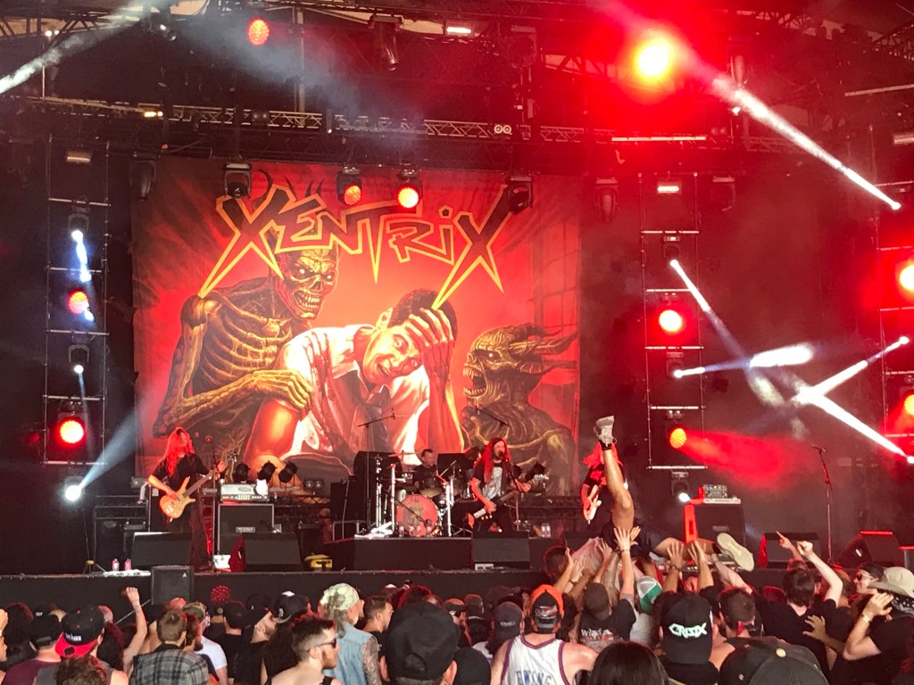 Par le nom alléché, tu files en Warzone voir le set de Guerilla Poubelle, indifférent aux accusations dont fait l’objet le chanteur Till Lemoine – le patron du Hellfest Ben Barbaud rappellera dans son cas comme dans d’autres que son métier est moins de rendre la justice que de programmer des concerts. Leur punk-rock est sans surprise, pas mal de spectateurs connaissent les paroles des chansons et le discours de Lemoine commence bien. « Maintenant, une chanson sur les potes qu’on perd parce qu’ils décèdent ou parce qu’ils sont devenus des grosses merdes. » La suite des interventions ira toujours plus loin dans l’originalité keuponne, brocardant coup sur coup Emmanuel Macron, la maréchaussée et les climatosceptiques. Devant un public aussi conservateur que celui de la Warzone, tant de courage politique émerveille. Toi, tu attrapes la fin de la performance de Knocked Loose, un hardcore passablement brutal pour le Mainstage 1. Un voisin au slip léopard et au sac banane doré apprécie franchement. Originaire du Kentucky, le chanteur strident a des accents de Zack de La Rocha. Peu de chances que l’ombre d’Altar t’offre un quelconque apaisement : il fait bougrement chaud sous la tente et les Anglais de Xentrix ne comptent rien arranger. La B.O. de Terminator 2 envoyée en préambule dit clairement leurs intentions. Le thrash metal britannique est aussi reconnu que l’humour allemand, c’est-à-dire pas des masses, mais ces vétérans-là connaissent leurs riffs de bûcherons. D’ailleurs le pit ne désemplit pas ; un type y plonge avec un casque militaire, il faudrait pouvoir demander la VAR pour attester de la légalité de la manœuvre. Xentrix étale trop d’influences évidentes pour jouer en Champions League mais en remontre à bien des rivaux allemands et américains.