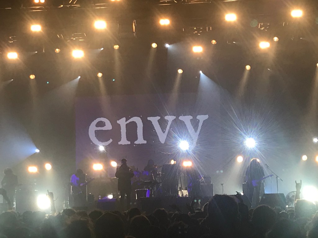 Tu ne suivras pas les têtes d’affiches costumées de Ghost passé les deux premières chansons – et ne verras donc pas Tobias Forge s’excuser d’être incapable de finir le set faute de voix – vu que tu étais de leur (très bon) concert de Bercy programmé ce dernier lundi de Pâques, soit déjà un fameux blasphème en soi. Non, ce qui te titille, c’est du moins attendu, les auteurs de l’une des performances les plus remarquées du Hellfest 2019, le groupe japonais Envy qui investit la Valley après les débuts du Pape et de ses goules anonymes. Leur style pourra dérouter les purs techniciens en quête de sophistication : les concerts d’Envy s’appréhendent avec les bas morceaux plutôt que du haut d’une riche expérience en solfège. Ils sont un peu à la bourre mais toi, tu es cueilli d’emblée, moins résistant à leur came qu’une fleur des champs au sécateur. Les morceaux sont autant de lentes montées en puissance, calmes de prime abord, baignées de douces lumières qui placent les musiciens à contrejour. Résonne alors l’explosion screamo attendue d’un chanteur soudain écorché vif, tandis qu’autour lui les gratteux s’engagent physiquement à en tomber par terre. L’effet produit chez le sujet consentant est une irrésistible remontée d’émotions brutes et plus ou moins enfouies. Le phénomène se fait prévisible à la troisième ou quatrième chanson, et le procédé est un poil roublard ? Possible, mais ça fonctionne, à en juger par la quantité de larmichettes qui viennent s’ajouter aux tiennes. Tu ne connais pas d’équivalents à ce travail-là, et sors de ce concert tout aussi vidé et ravi qu’après Sepultura bien qu’infiniment moins en nage.