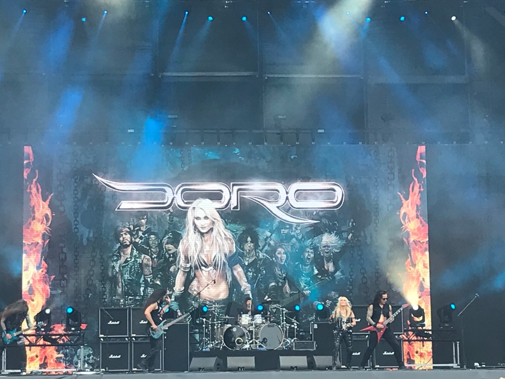 Arrive peut-être le moment injuste du festival, certes inévitable, où une manière de saturation sonore t’empêche de bien piger une proposition musicale. En ce qui te concerne, le sort a désigné Regarde les hommes tomber, piliers du Hellfest From Home organisé l’an passé. Pour autant que tu puisses en juger, leur black metal est à la fois rapide et lancinant, le chanteur en toge s’avère démoniaque comme il faut, mais le son entre par ton oreille gauche sans faire bouger ta couille droite. Basta, tu décolles vers Jesus Piece en Warzone pour relancer la machine. Le hardcore des Pennsylvaniens consiste peu ou prou à napper un bon gros punk de la même sauce piquante dont Inter Arma assaisonne son sludge. Ça fonctionne : tu kiffes. Merci Jésus ! Tu redoutes pourtant un choc aussi stylistique que générationnel en t’approchant du Mainstage 2, plutôt accessible avant le set de Doro. Fait remarquable, l’ex-chanteuse de Warlock qu’on surnomme la Metal Queen honore cette année sa première invitation sur le nouveau site du festival. « Do you like old school metal ? » demande-t-elle d’entrée, ceinte d’une combinaison à base de cuir et clous mettant en valeur une silhouette inchangée à bientôt 60 piges. Mieux vaut répondre « Oui » à ladite question, tant le répertoire de Doro Pesch ferait une B.O. appropriée pour une prochaine saison de Stranger Things (oui, avec le chanteur de Primordial s’il a survécu). Toi, tu goûtes les refrains catchy, les riffs d’une efficacité toute germanique et l’enthousiasme indiscutable de la dame.