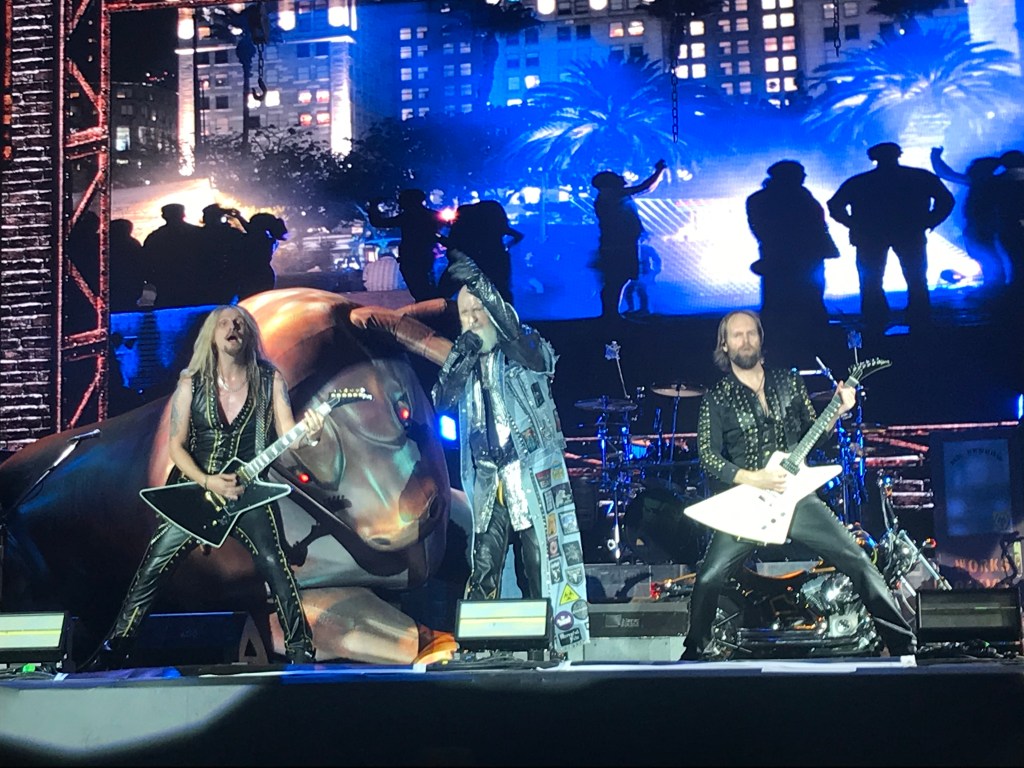 Car dans le décor d’usine des West Midlands dressé sur le Mainstage 2, alors que résonne le War Pigs des voisins de Sabbath, s’avance maintenant un Rob Halford pâle et septuagénaire. Il te coûte de le reconnaître, mais le frontman de Judas Priest ne dispose plus que d’une petite moitié de l’organe de harpie qui fit sa légende – on parle de sa voix. Elle ne permettrait plus de briguer le titre de plus grand chanteur de heavy metal depuis la mort de Ronnie James Dio, mais lui suffit à prendre un pied ostensible sur scène, et toi avec lui. Costumes de motard abracadabrantesques, Harley Davidson chevauchée sur Hell bent for leather, fouet généreusement administré à ses partenaires, Rob s’éclate toujours avec ses jouets favoris. La setlist parcourt avec intelligence plus de 50 ans de carrière, le duo de guitares lead Faulkner-Sneap honore la mémoire de Downing et Tipton, les machines Hill et Travis assurent imperturbablement en section rythmique. Et Turbo Lover sonne tout de même mieux sans les synthés, bordel. D’une manière plus digne que Deep Purple, Judas Priest rappelle combien le temps est le principal ennemi d’un genre musical contraint au renouvellement accéléré de ses têtes d’affiches – à voir l’état des Rolling Stones, on étendra la considération au rock n’roll dans son ensemble. Mais puisque tout n’est pas à jeter dans cette époque de merde, l’une des plus formidables puissances émergentes du métal contemporain est un groupe français, les Aquitains de Gojira, récents n°1 du Billboard Hard Rock américain avec Fortitude. De quoi remplacer mieux qu’honorablement System of a Down, prévus en clôture du festival au temps lointain où l’on envisageait un Hellfest en 2020. Le groupe de Joe Duplantier a soigné la dimension visuelle de son show, succession de tableaux souvent abstraits et colorés agrémentés d’effets pyrotechniques et de lâchers de papelitos ; chez Gojira, les écrans géants se complètent plus qu’il ne se répliquent. Single du dernier album, Born for one thing ouvre la setlist. Accentuant la batterie d’un Mario Duplantier dont c’est l’anniversaire, le mix rappelle qui est la star. « Est-ce que vous êtes vivants ? » demande son frère Joe, après quoi on constate combien il est facile de se prendre pour James Hetfield une fois dressé devant 50000 spectateurs en transe.