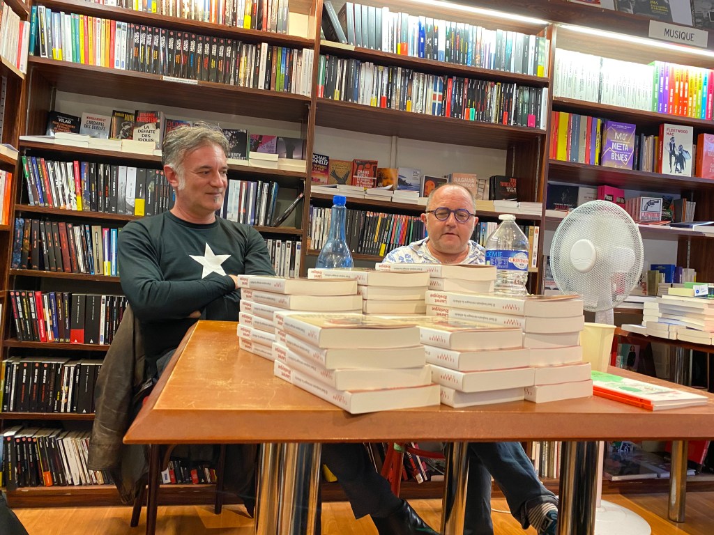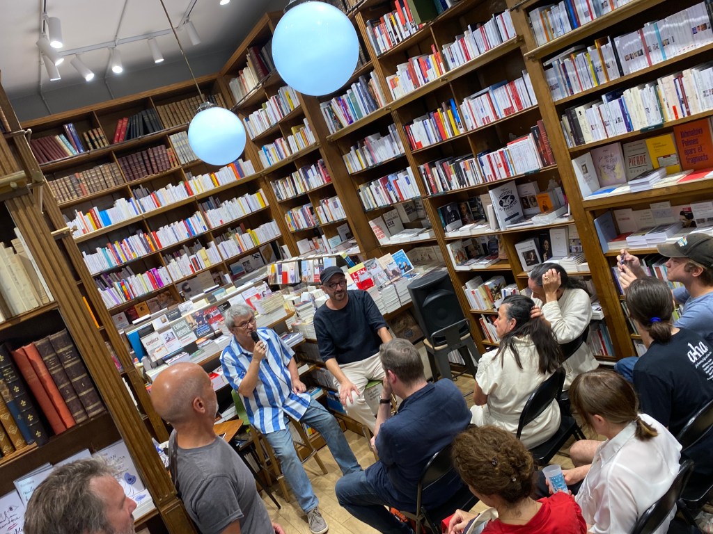 - On fut nombreux à venir suer chez Delamain, en face du Palais Royal, aux derniers jours de la canicule le 6 septembre dernier. L’événement était d’ampleur : comme le fit remarquer Marc Villemain, intervieweur d’un soir, éditeur du roman dont il était question et propriétaire d’une impressionnante collection de chemisettes, cela faisait huit ans qu’Éric Bonnargent ne nous avait pas gratifiés d’un nouveau livre. Apparemment le covid aura aidé l’auteur à remettre l’ouvrage sur le métier. Ledit ouvrage s’intitule Les désarrois du professeur Mittleman, et pencherait assez franchement vers l’autofiction selon Villemain ; c’est loin d’être un reproche dans la bouche de l’éditeur, fan revendiqué d’un Philip Roth qui « allait sur les chemins de l’autofiction », c’est à dire d’une « sublimation du récit de soi ». Bien que « prof de philo blanc et hétéro exerçant en banlieue » à l’instar de Mittleman, l’auteur, lui, ne raffole pas de l’idée. Voire, elle l’agace. Ce qui arrive au protagoniste ne lui arrive pas à lui. On pourrait plutôt comparer Mittleman et Bonnargent au tandem Bovary – Flaubert. Il s’agissait surtout de trouver un environnement où être à l’aise en tant qu’écrivain pour traiter l’idée de vieillissement, avec en arrière-plan une question lancinante : est-on condamné à devenir réac ? Mittleman est dur avec le monde entier, dont lui-même. Amours, publications, il estime avoir tout loupé sauf ce qui l’intéressait le moins, le professorat. Or s’il est insatisfait, Mittleman a tout de même réussi des choses… sans bien connaître le rayonnement académique d’Éric Bonnargent, le nombre de ses élèves présents dans la librairie laisse imaginer qu’il est parfois apprécié lui aussi en tant qu’enseignant. Villemain enchaîne sur deux éléments du bouquin largement soulignés par ses premiers lecteurs : la critique du mammouth éducatif français, secondaire selon lui, et la sensibilité de Mittleman, alors que l’éditeur le trouve plutôt « misanthrope » et « en plein désarroi métaphysique ». Là encore le tandem n’est pas complètement en harmonie : Bonnargent tenait avant tout à montrer en quoi consiste la vie de prof pendant les cours, un point de vue pas si fréquent en littérature, le mélange d’apports, de police et de réactivité qui fait le pédagogue accompli. Le style des enseignants a dû évoluer avec le temps – ce qui a changé est la proportion d’élèves en difficulté et leur rapport à l’autorité. Quant au moi profond de Mittleman, il lui trouve au contraire une vraie gentillesse sous sa misanthropie de façade. « Moi, je l’aime bien. » « C’est bien de l’autofiction ! » triomphe Villemain, avant de passer le micro à la salle. On apprend alors que l’auteur ne compte pas spécialement envoyer son opus au nouveau ministre (« Je crois qu’il s’en tape »), que les dialogues pour le moins originaux où ne figure que la voix du professeur répondaient à un besoin de cohérence et de lisibilité, que sa présente rentrée « est une rentrée » à défaut d’être « bonne » et que son prochain roman abordera la boxe, la religion et l’élevage industriel des poules. On espère l’attendre moins de huit ans. Dehors, il fait tellement chaud que je bois un Pulco plutôt qu’un blanc tiède. La rentrée est dure pour tout le monde.