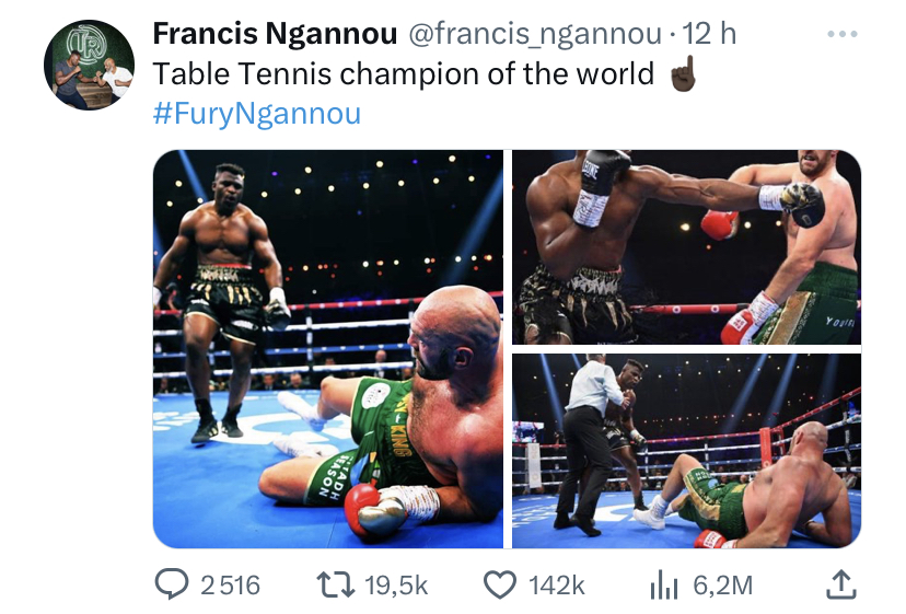 - On le répète, la décision rendue hier est purement anecdotique. L’unique vainqueur de la soirée est bien Francis Ngannou. Il méritait déjà l’admiration pour son parcours, champion UFC après avoir ajusté son style entre les deux combats contre Stipe Miocic, capable de basculer vers le plan B victorieux une fois deux premiers rounds concédés à Cyril Gane, puis impassible dans son bras de fer contre Dana White jusqu’à faire sauter la banque en attirant Fury sur un ring. Au fond, le Prédateur n’a fait que confirmer hier soir ce qu’on savait de lui : il bosse, il est discipliné, et il réfléchit. À 37 ans, Ngannou ne s’est pas réinventé d’un coup : il a travaillé sa caisse pour tenir 10 rounds, il a évité de (trop) boxer dans le vide pour ne pas épuiser son plein d’essence, il a gardé les mains hautes et donné un jab correct, servi par une allonge guère moins impressionnante que celle de Fury, il a alterné les attaques au corps et à la face, il a travaillé des déplacements cohérents, mobile jusqu’au bout et capable de maintenir la pression sur son adversaire (le genou était manifestement plus frais que contre Gane), il a montré dans le clinch combien son expérience du MMA était utile de près contre un adversaire pondéreux, il a même basculé plusieurs fois en garde de gaucher pour que Fury le décrypte moins facilement. Si l’on parlera longtemps du knockdown obtenu au 3e round, il ne faudra pas oublier non plus une 8e reprise où il contraignit le « Gipsy King » à s’accrocher pour survivre, franchement secoué sur une méchante droite. Seuls Deontay Wilder et le baiser de la mort qu’il cache dans son gant arrière avaient fait aussi mal au champion WBC des lourds, ce qui dit beaucoup, gros gants ou pas, de la puissance de semi-remorque du Camerounais. Quoi qu’il advienne à compter d’aujourd’hui dans son parcours en boxe anglaise, sa provision de respect est rigoureusement inépuisable. On lui pardonnera même d’autres tentatives de Superman punch. Des mines de sable du Cameroun aux ors de Riyad en passant par les nuits dans la rue à Paris, gageons que le biopic est d’ores et déjà en préparation.