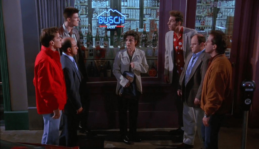 On le pressent à la lecture de ce qui précède : Seinfeld n’hésitait pas à s’aventurer sur le terrain du politiquement incorrect, s’agissant en particulier des stéréotypes raciaux. Être programmée après 21h permettait certaines libertés, y compris sur le très corseté network NBC. Vu de 2024, la série s’avère carrément trash, sans s’autoriser de mots polémiques pour autant. Imaginez que The Contest, largement reconnu comme LE meilleur épisode de Seinfeld toutes saisons confondues, pour ne pas dire de l’histoire des sitcoms US, évoque la masturbation sans jamais que le mot soit prononcé. Il s’agit littéralement d’un concours entre nos protagonistes dont le vainqueur se sera montré capable de ne pas se toucher le plus longtemps des quatre… et tous seront bien sûr soumis à d’inhumaines tentations. En résulta la très emblématique interrogation : « Es-tu toujours maître de ton domaine ? » Imaginez le séisme — et l’hilarité générale — en 1992. Seinfeld brisera un autre tabou de sitcom en abordant à plusieurs reprises la question épineuse du cunnilingus : penaud, George confie à Jerry dans The Mango qu’il se fit tapoter l’épaule en plein effort — l’équivalent d’un joueur se faisant sortir du terrain par son coach. Dans The Rye, Elaine obtient enfin ladite gratification de son amant saxophoniste juste avant une audition… que sa mâchoire fatiguée lui fait louper dans les grandes largeurs.
