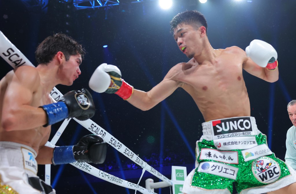 - À commencer par la tête d’affiche de la soirée, le champion WBC Junto Nakatani, opposé pour une fois à un homme de son gabarit chez les coq en la personne de David Cuellar Contreras. On le sait depuis l’an pèbre : la boxe mexicaine est comme une boîte de chocolats dont beaucoup seraient fourrés à la strychnine. Comme le confirmerait plus d’un promoteur anglais, un jeune invaincu du cru jamais sorti de son pays, détendu comme tout au moment du ring walk, a tout du gâcheur de fête potentiel. En l’occurrence, Cuellar aura surtout servi – à son corps défendant – à démontrer la polyvalence de Nakatani. Guère aérien sur ses appuis, le Mexicain est de ce genre de grandes tiges qui apprécient pourtant le combat rapproché, quand on sait la mante religieuse « Big Bang » habituée à disséquer méthodiquement l’opposition à distance. Et si Nakatani est un homme d’habitudes, il n’est pas non plus fermé à deux sous de variété. En témoigne la parfaite fluidité de l’enchaînement de près, terrible et somptueux, qui envoya une première fois Cuellar au tapis à la 3e reprise : une paire de piqûres au corps pour attendrir et faire baisser les mains, une autre de crochets à l’étage pour sonner, puis un cross au corps paralysant et un droite-gauche conclu par un crochet du bras arrière à pleine puissance sur le museau. Cuellar ne se releva que pour regoûter à la gauche adverse et s’affaler à nouveau, le visage aussi marqué par une coupure au nez que par l’effroi littéralement suscité par l’expérience. Son expression disait tout de ce que Junto Nakatani inflige à ses victimes. On regretterait presque que tant de défis intéressants subsistent chez les coq, catégorie aux quatre champions du monde japonais sans même compter l’émergence de Tenshin – une première unification contre le titulaire de la ceinture IBF Ryosuke Nishida est en cours de négociation. Car LE combat qu’attendent les vrais amoureux du noble art est plus que jamais un Inoue vs Nakatani promis au titre de plus belle affiche dans l’histoire de la boxe nippone. Vivement.