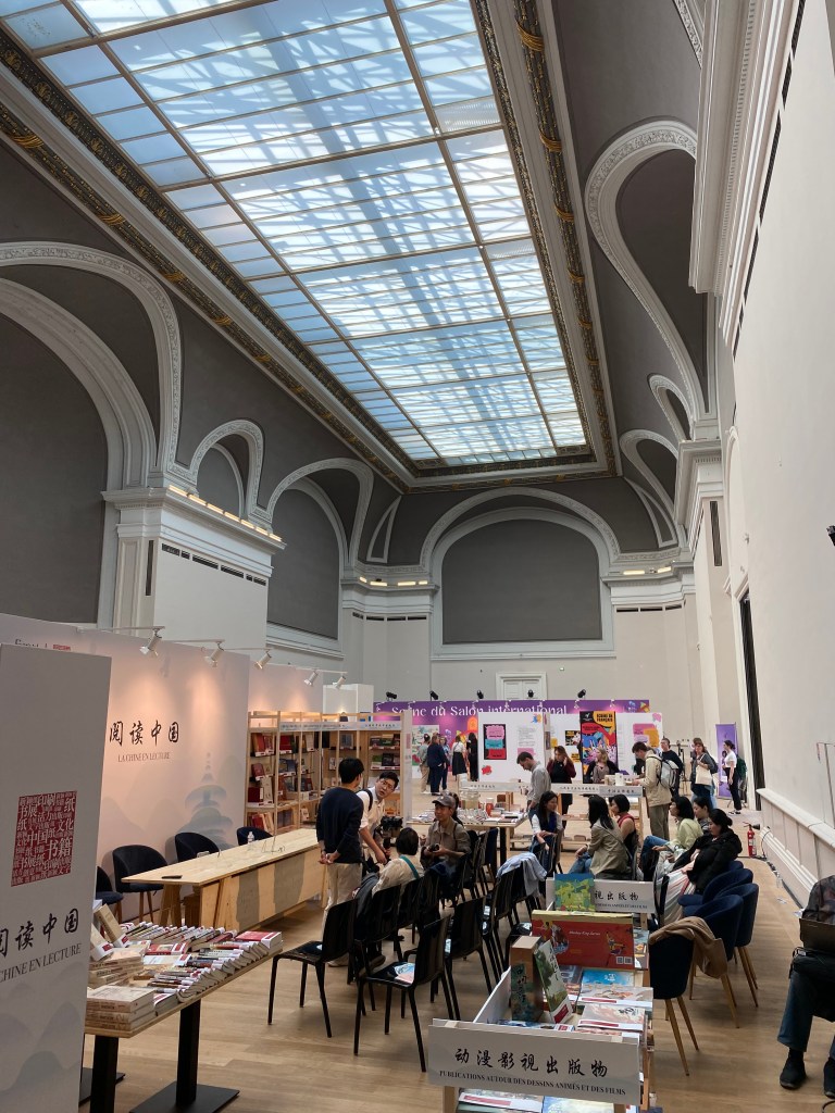 - Un autre espace au calme est dédié au « B2B », il accueil des échanges feutrés et de luxueux stands chinois ou dubaïotes sur lesquels on ne se presse guère. L’acoustique du Grand Palais étonne lorsque le volume remonte d’un coup à peine franchie sa porte ouverte. Vous atteignez l’emplacement d’Hugo Publishing et sa file d’attente aussi fournie que celle de l’entrée du Festival. Les deux garçons perdus dans ce gynécée se sont peut-être égarés à la recherche de l’espace bière et football. Y succède une rangée de « petites et jeunes maisons d’édition », a priori pas menacées par le Goncourt, dont ta favorite s’avèrera R.J.T.P. pour « Réfléchir n’a Jamais Tué Personne », apparemment aux antipodes idéologiques de Fayard période Boëll. À propos de progressisme revendiqué, le repaire des danseur.ice.s aperçus lors du happening en contrebas est apparemment une salle « conçue comme une revue vivante » et baptisée Cabaret Extra!. Sur la scène dédiée, l’heure est au tarot littéraire. Par voie de conséquence, il est temps que tu quittes les lieux, non sans avoir croisé une jeune organisatrice en T-shirt « Médiateur » – mazette, à croire que d’aucuns se mettent dessus pour un accès privilégié à Marc Levy – puis un groupe de collégiens enthousiastes et (parce que ?) coiffés de la houppette de Titeuf. Les temps sont durs, mais demeurent festifs.