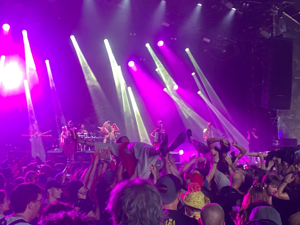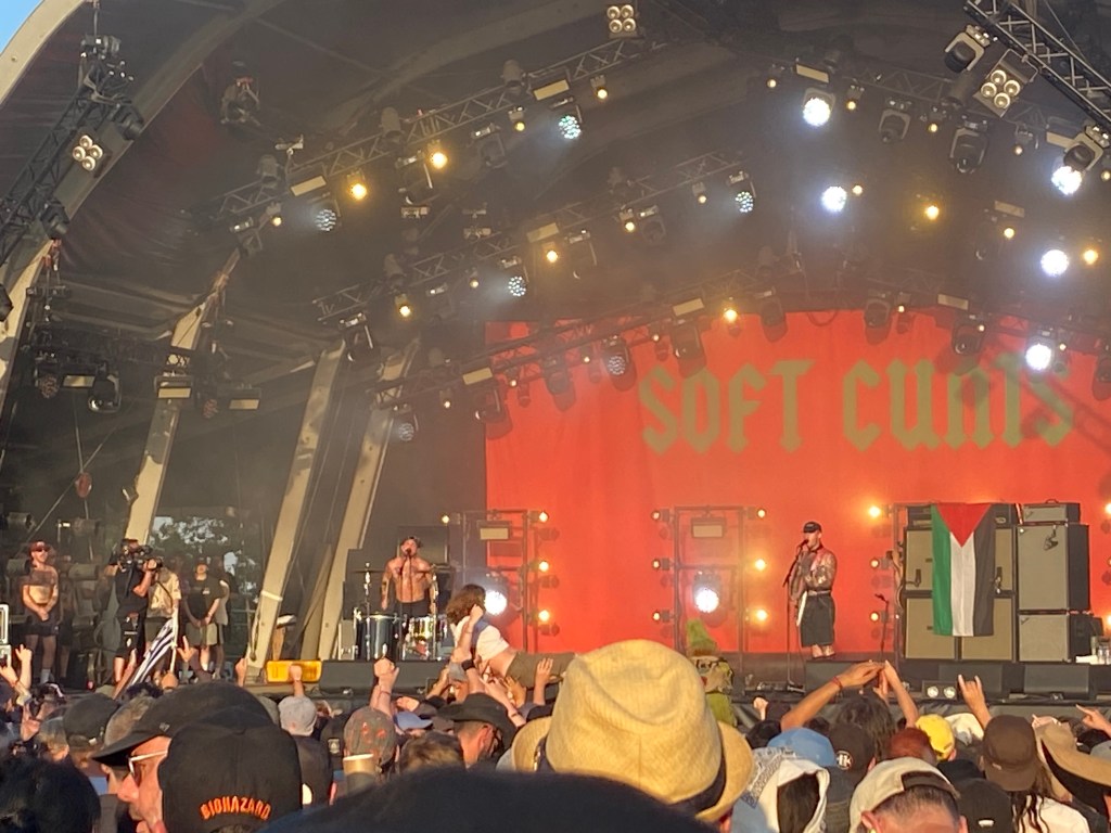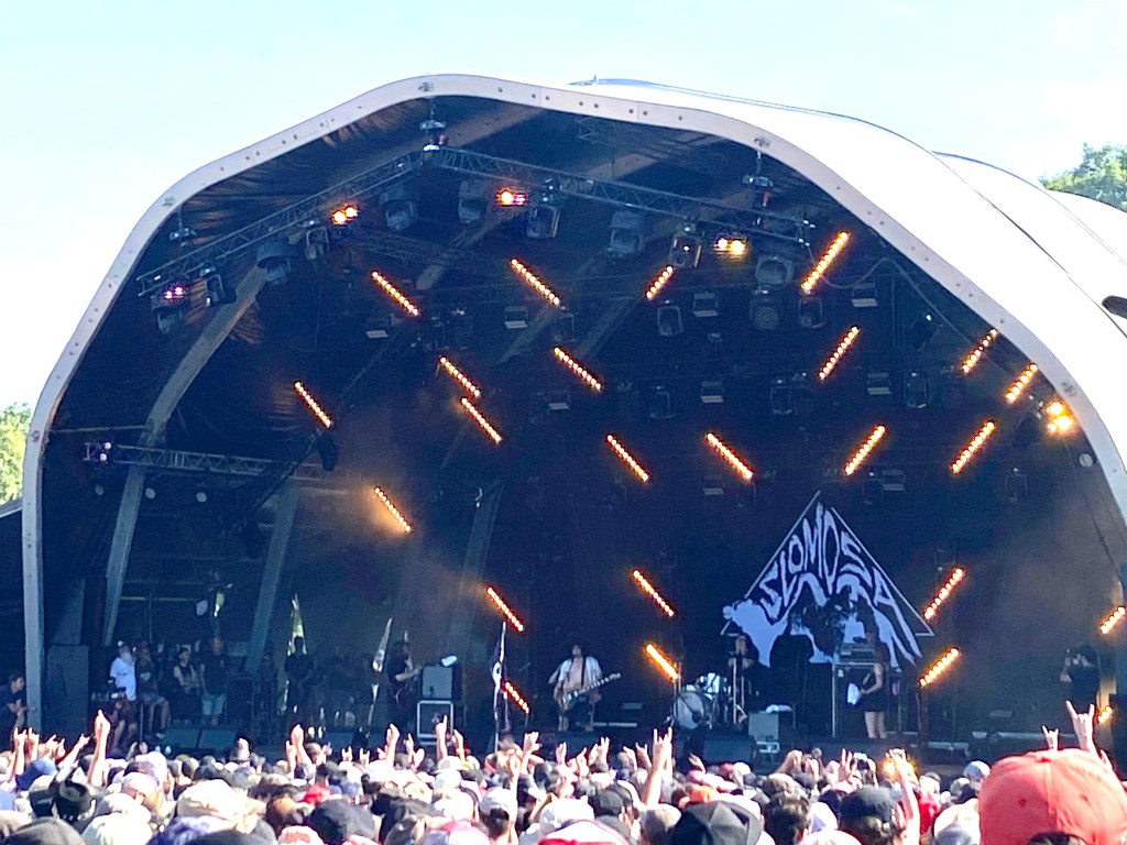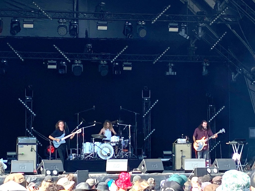 Il est temps de faire découvrir Valley à tes potes béotiens : va s’y produire Slomosa, un groupe dont tu attends le retour depuis leur prestation très à ton goût de l’édition 2022. Tu n’es d’ailleurs pas le seul, à en juger par la foule très dense ondulant dans la fournaise au son du desert rock planant et fuzzy des Norvégiens. Le chanteur et guitariste rythmique à afro luxuriante Benjamin Berdous, chemise ouverte et Puma noires, fait l’effort de présenter son groupe en français, avant de constater non sans raison « There are so many fucking people here ». Il insistera dans la langue de Bernie Bonvoisin en invitant Trump, Netanyahu et Marine Le Pen à une gratification buccale. Un copain te glisse qu’il aurait la tête d’Adam Sandler, un rappel que votre équipée ne rajeunit pas – en tout cas au plan ophtalmologique. En revanche, deux Vincent Macaigne assurent bien batterie et guitare lead. Présente dans le mix, la bassiste Marie Moe accompagne Berdous au micro ; elle n’est pas non plus désagréable à contempler. Même quand les riffs s’énervent, Slomosa laisse une impression de douceur. Un mosh pit guère violent s’esquisse d’ailleurs sur le dernier titre. Les amis sont contents : ce set-là est un franc succès.