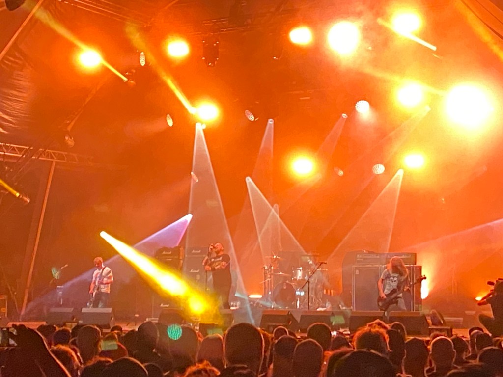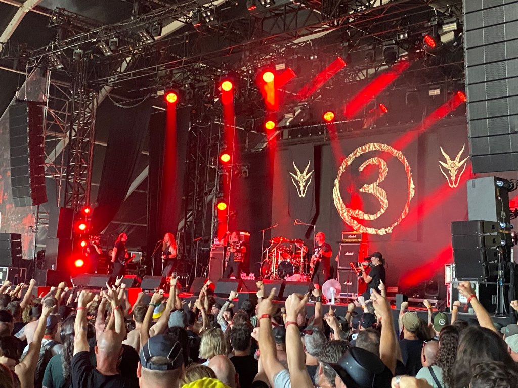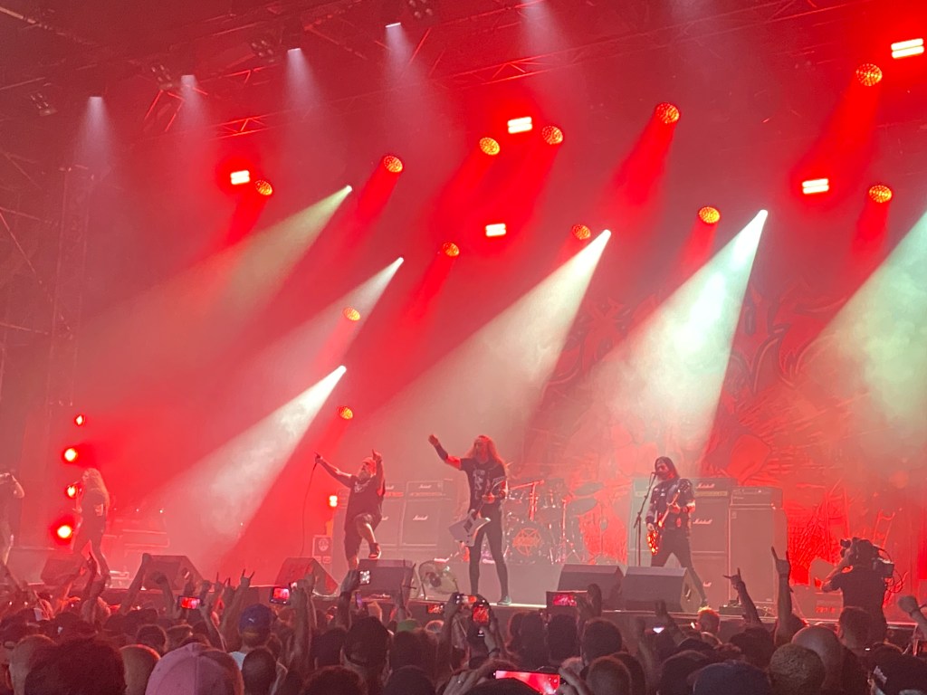 À partir de là, tes notes ne sont pas très lisibles : la tente est blindée, ça remue sévère et l’air brûlant se fait rare. Fabulous disaster file à 200 à l’heure, le tir de barrage sonore ne faiblit pas sur Deathamphetamine puis Blacklist, le batteur Tom Hunting a décidément bien récupéré de son cancer digestif et tu t’interroges sur tes chances de survie à court terme. Dukes gratte le manche (non) de Holt sur le solo de The beatings will continue, puis annonce « This next song was written 40 years ago. Was any of you around?« . Au moins le prétend-t-on. « That’s fucking cool!« , puis résonne le riff délicat d’un A lesson in violence dantesque qui te fera t’accrocher à ton slip. Après 17 minutes de set en temps subjectif, l’heure est déjà au rappel : Holt démarre Raining Blood avant d’enchaîner sur Toxic Waltz, hymne des mosh pits réussis, l’occasion pour une Prika Amaral souriant comme une môme de venir prêter main forte à ses confrères. Binôme de Gary Holt, Lee Altus fait monter sur scène une très jeune spectatrice pour plaquer trois accords. Un ultime wall of death sur Strike of de beast vient clore comme de juste une performance qui t’aura laissé pantelant mais ravi, dans le style délicat et tout en retenue de Sepultura ici même en 2022.