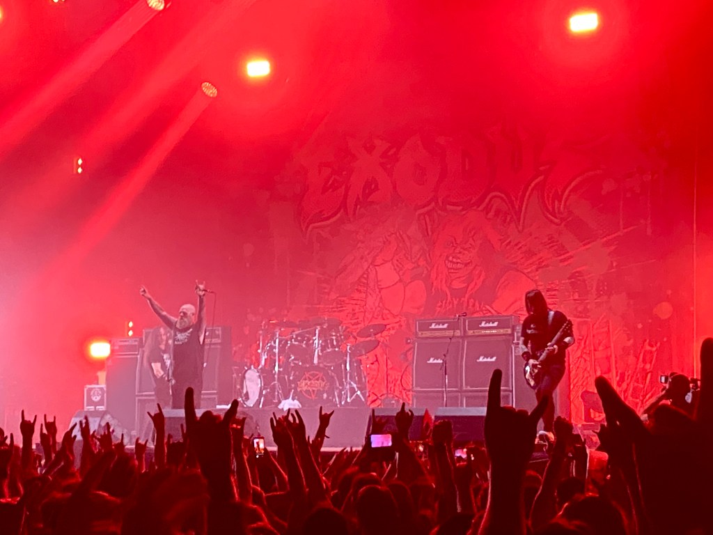 L’enchaînement avec Exodus en Altar promet une bascule des plus brutales vers un premier degré souverain. Alors que We will rock you résonne en introduction, les familiers des vétérans de la Bay Area savent qu’en termes pugilistiques « rock » signifie aussi « sonner ». Avec le (nouveau) remplacement annoncé de Zetro Souza – aka le Bon Scott du thrash – par Rob Dukes, le set prendra de fait une coloration metal extrême, confirmée par la puissance d’arrêt du Bonded by blood servi chaud en apéritif. Calvitie et gabarit le rapprochant d’un Philippe Etchebest barbu, Dukes a vieilli mais pas sa voix, entre cri de thrasher et growl de death métalleux. Ni sa prestance, d’ailleurs, lui qui arpentera la scène de long en large comme un général inspecte ses troupes, histoire de s’assurer que le pit chicote comme il se doit. Craché par un mur de gros amplis Marshall en sus de la sono d’Altar, le son n’est pas d’une netteté folle. La branlée acoustique donnera l’impression tout le set durant qu’Exodus pousse son matos dans ses derniers retranchements. À ce propos, ça joue vite, plus encore que sur album – ceux qui savent, savent – et dès War is my shepard les techniciens s’affairent pour résoudre en direct force pépins mécaniques. Inutile de préciser que Gary Holt, toujours ceint du mythique T-shirt Kill the Kardashians, déroule des kilomètres de solos à te faire trouver quasi atmosphériques ceux de Slayer trois semaines plus tard.