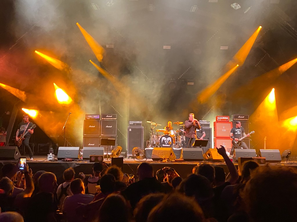 Autre colosse et autre style : avec Tony Sylvester de Turbonegro en Warzone, on passe au look motard en bas résille. Le groupe de deathpunk norvégien s’est rendu fameux pour son goût du déguisement – imper en cuir, calot de petit mousse et salopette fermière complètent le tableau – et du joyeux détournement des codes LGBT+, fond de teint et mascara à l’appui. Il ont aussi la réputation de tout déglinguer sur scène, et la voici largement confirmée par la prestation du soir. Car pour ces Village People keupons il ne s’agit pas de se regarder faire les pitres entre 1 et 2 heures du matin : d’abord et avant tout, on joue carré un mélange breveté de heavy metal et de punk, quand bien même Sylvester entretient un rapport gentiment ambigu à son micro et mime sur son guitariste en plein solo une fellation à faire rougir le public du Cap d’Agde. Devait-il vraiment enchaîner sur une périlleuse plaisanterie bilingue à propos de « Clisson » et « clitoris » (gros comme « la huître ») ? Ce n’est pas dit, mais le public achète, comme il kiffe une setlist largement issue d’Apocalypse Dudes, première galette du groupe (dont le délicat Rendezvous with anus) et conclue sur un glorieux I’ve got erection dont le refrain sera repris a cappella par beaucoup lors de la looongue marche vers la sortie du site – si l’entrée relookée a franchement de la gueule, la gestion des flux ne s’en est tout à fait pas vue optimisée.