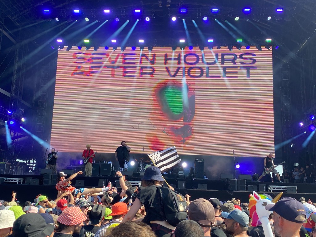 Le très imposant Taylor Barber, frontman des Seven Hours after Violet qui prennent le relais en Mainstage 2, serait moins crédible que Benji Webbe en moniteur de Pilates. On l’imaginerait presque entonner Somewhere over the rainbow armé d’un ukulélé. Du peu que tu saches de ce groupe de metal alternatif, il s’agit d’un projet du chauve et remuant bassiste de System of a Down, Shavo Odadjian. Dans ce que tu ne sais pas encore à l’heure du concert, l’un des deux guitaristes fut finaliste d’une édition américaine de la Nouvelle Star. Alors que la proposition musicale te semble confuse, deux phénomènes altèrent ta perception. D’une, ça sent très fort la beuh, et de deux pas mal de tes voisins ne sont manifestement pas là pour cueillir le muguet : ça castagne sévère tout coude dehors, voire ça joue de la balayette, en particulier un pénible teigneux pourtant déguisé en Petite Sirène. Ho les gars, la Warzone, c’est au fond à droite. Les bribes sonores que tu parviens vaguement à analyser en évitant les chamailleurs évoquent un bordel voisin de SOAD, en plus heavy et moins inspiré, ce qui n’empêche pas une jeunette à bob OBUT et un moustachu en marcel façon Tom Jones – les mailles sont larges – qui brandit une hampe à tête de licorne de s’éclater dans le pit. Tiens, on alterne avec des séquences plus calmes et des refrains quasi disco, puis Taylor Barber étonne dans un registre guttural. La perte de repères est à peu près totale. Un type coiffé d’une crête en kilt et caleçon à canards jaunes demande un peu d’aide pour slammer. Son T-shirt proclame « Nazi lives don’t matter ». Disons que c’est plus limpide que du Seven hours after Violet.