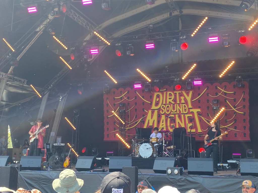 Cette intense matinée appelle une pause. Alors que TNT d’ACDC résonne depuis les Mainstages, tu tentes une première visite au merch Artistes… pour constater que Castle Rat, apparemment en fin de tournée, est dépouillé depuis longtemps des T-shirts à ta taille. « Boire des bières, détruire des villages » proclame l’uniforme choisi par une mignonne petite famille de festivaliers, parents et enfants réunis. Commander une nouvelle pinte de Carlsberg pour humecter ton potato burger te donne l’occasion de discuter avec un bénévole du bar. Apparemment, il vend peu de Grimbergen par 35 degrés à l’ombre. La nouvelle rassure presque. Tu retournes en Valley pour une nouvelle dose de fuzz avec les Suisses de Dirty Sound Magnet. Identiques à celles de ta grande baffe de 2024 assénée par Gozu, les conditions – créneau de 13h le vendredi, soleil de plomb, Valley – te rendent optimiste. Après Wormsand, il s’agit encore d’un power trio, moins agressif et plus résolument psychédélique que les minots français, au look à pique-niquer en bord du canal Saint-Martin. Drapé dans une ample chemise rouge, le gratteux aux faux airs de Cillian Murphy joue d’une bien jolie SG custom, enfin te semble-t-il, mais sa voix accroche un tantinet tes tympans. Voilà qui gâche un peu l’appréciable groove ambiant ; heureusement le mec n’est pas outrageusement bavard. Tu distingues une dose de folk dans la proposition, puis le chanteur forme le A de YMCA avec les bras avant le Y, tout en entonnant une étrange mélopée, un possible hommage à The Hu (programmés plus tard en Mainstage 1). Sans doute y a-t-il beaucoup de sens là-dedans, en tout cas tu apprécies que ça redémarre nerveusement. La gestuelle du batteur rappelle celui du Muppet Show, sa tête évoquant plutôt Guillaume Canet. Tout ça concourt à un set honorable à défaut de révolutionner la Valley, ce qui te décide à poser un cul en solitaire au Bois du Muscadet.