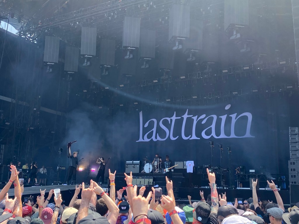 Un copain novice t’a confié avoir eu son moment « Qu’est-ce que je fous là ? » hier pendant Slomosa. Rien que de très normal, lui assuras-tu en rappelant ton expérience de 2018, et le phénomène ne te menace en aucun cas 7 ans plus tard. Cela étant il s’agit de gérer le manque de sommeil, une chaleur de bête et quelques bières au compteur, d’ailleurs un jeune tout proche est répandu sur le ventre, immobile et couvert de poussière, et ses voisins suggèrent peu charitablement qu’il cherche peut-être des truffes tandis qu’on l’enjambe tel un vague obstacle de cross country. Tu pourrais facilement avoir l’âge de son daron. Le tableau te ramène à quelques principes élémentaires en matière de gestion de l’effort long. En bref, la prochaine Carlsberg attendra un peu. Ceux que tu vas maintenant voir en Mainstage 1, Last Train, sont des contemporains du dormeur pulvérulent. Une avancée est érigée devant la scène, sans doute une initiative de Muse, tête d’affiche du soir qui fait jaser depuis des mois. On pourrait aussi s’interroger sur la légitimité au Hellfest du quatuor alsacien. Le type en T-shirt « Dirty douchebag », qui fait présentement l’éloge de Steel Panther à côté de toi sera-t-il conquis par l’indie rock labellisé Inrocks qui vous est promis ? Un « suce ma bite » retentissant à l’entrée des minots diffuse alors un semblant d’inquiétude. Le set commence d’ailleurs fort paisiblement, avant qu’un riff aussi costaud qu’opportun vienne rappeler qu’on n’est pas tout à fait à We love green. Très en avant dans le mix, la basse semble chargée de maintenir cette impression, fût-ce un peu artificiellement. Un air de marche militaire fait place à une mélodie burnée à la Franz Ferdinand tandis que le blond guitariste et chanteur crie carrément. On sent ici un certain attrait pour le gros son de guitare en lui-même. Fait intéressant, les types ne sont pas franchement beaux gosses, vague gage d’authenticité, tout en dégageant un charisme certain. En attendant, les titres sont longs et les structures se font de plus en plus progressives, sans que l’ennui te gagne particulièrement – c’est à noter. Le second guitariste allume une clope.
