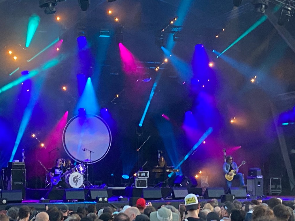Vous partez vous placer pour Airbourne, possiblement le groupe de plus prévisible du monde. Pourquoi diable ne pas te monter plus aventureux ? Et bien parce que d’une part tous tes camarades ne connaissent pas nécessairement la formule intemporelle des frangins O’Keefe, et que d’autre part le fan d’ACDC en toi ne détestera jamais pas le gros hard rock qu’on voit venir depuis l’horizon. Le concert de Kim Dracula en Mainstage 2 n’est pas tout à fait terminé, l’occasion de regarder en coin l’androgyne blond éponyme achever le sien en Mainstage 2. Devant des musiciens également en costume, le bougre met une fameuse conviction à rapper comme un chat qu’on écorche. C’est n’importe quoi, mais plutôt convaincant. Puis « Gutsy », le titre du dernier album d’Airbourne, apparaît sur l’écran géant du Mainstage 1 sur la musique de Terminator. Devant, un type en veste à patches 100% ACDC sait pourquoi il est venu. Et il y a toujours aussi peu tromperie sur la came, d’ailleurs la foule chante un blues rock fiévreux après l’autre et tape dans les mains, Joel O’Keefe jette des pintes à moitié pleines dans les premiers rangs – on notera l’effort d’innovation, en 2022 c’était des whisky Coca -, on envoie un peu de pyrotechnie et de serpentins histoire de, une authentique autoroute de slammeurs se met en place au milieu du pit et tu te surprends une fois de plus à sourire comme un niais découvrant la branlette. Joel pousse le sens du fan service jusqu’à faire un tour de la fosse à dos de roadie histoire qu’on en fasse de jolies photos. Le batteur Brett Tyrell actionne une sirène de raid aérien, le frontman réapparaît derrière les amplis, et après un hommage collectif à Marshall le final sur Runnin’ Wild fait secouer la tête sans qu’on s’en aperçoive. Binaire, gras et efficace.