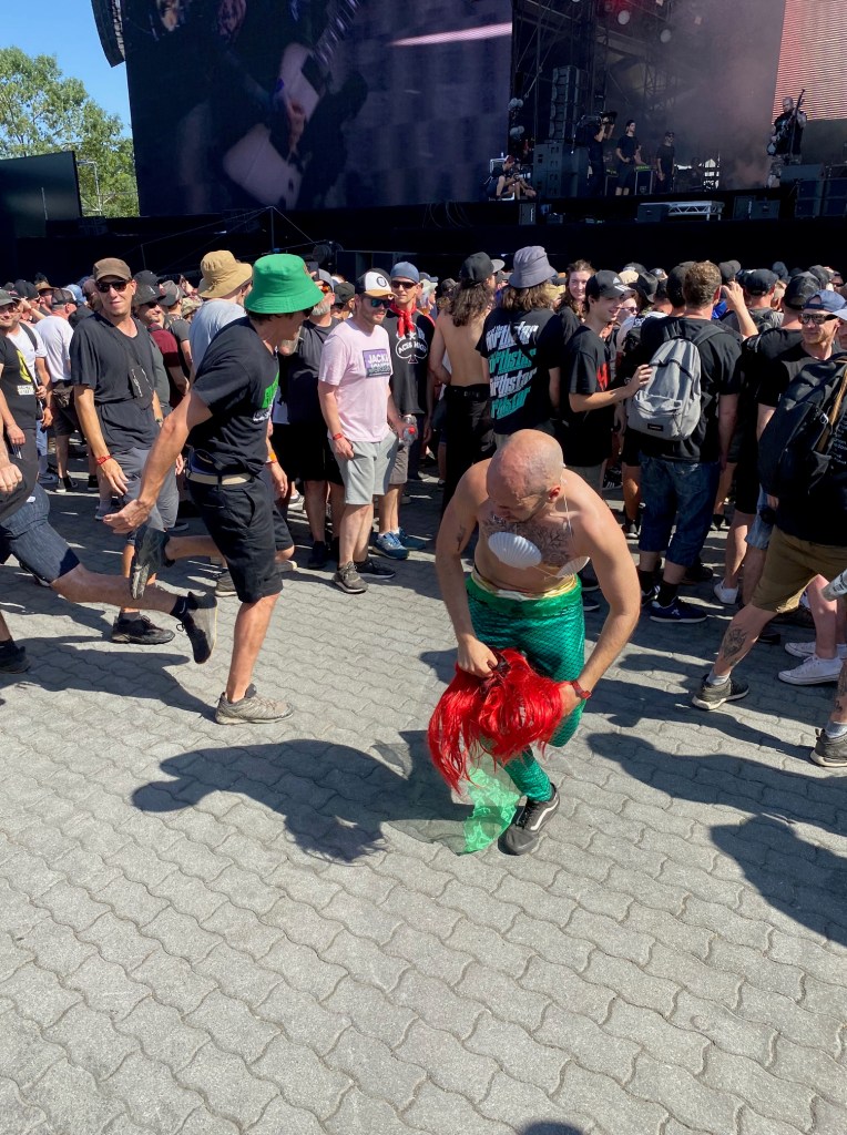 Sans l’intérêt particulier de faire découvrir le groupe à certains de tes copains, dont tu devines pour certains qu’ils seront pas mal clients, tu n’aurais peut-être rempilé à un concert de Trollfest. Si les Norvégiens sont classés en folk metal, on dira que l’intérêt premier de leurs performances live tient moins aux compositions interprétées – le saviez-vous ? les paroles sont en « trollspråk », hybride d’allemand et de norvégien – qu’à l’ambiance obligée de pétaudière décomplexée. D’ailleurs c’est en flamands roses que les zozos apparaissent au son de Carmina Burana. Pour peu qu’on tende l’oreille, ils jouent assez clairement du metal, mais le plaisir des yeux prend vite le pas sur la mélomanie, tous les pires déguisements du festival s’étant nécessairement donné rendez-vous en Temple pour battre le record de queue-leuleu (elle contournera le bar à l’extérieur) de 2019 ou enchaîner slams, paquitos, sautillements coordonnés et autres excentricités qu’on trouverait bien trop beaufs en camping deux étoiles à Six-Fours-les-Plages. Au moins l’effet recherché est-il au rendez-vous : on rigole en regardant Jésus Christ partir en slam, fût-ce par 38 degrés sous tente. D’ailleurs les copains ciblés étaient plutôt clients, forcément.